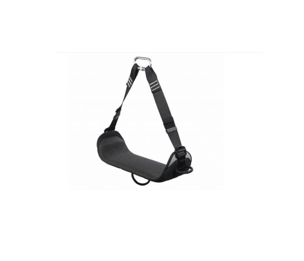 Assento para suspensão em poliéster com almofada em EVA e forro respirável, porta ferramentas e tamanho regulável. Acompanha mosquetão com abertura de 17mm e trava dupla com fechamento em rosca.