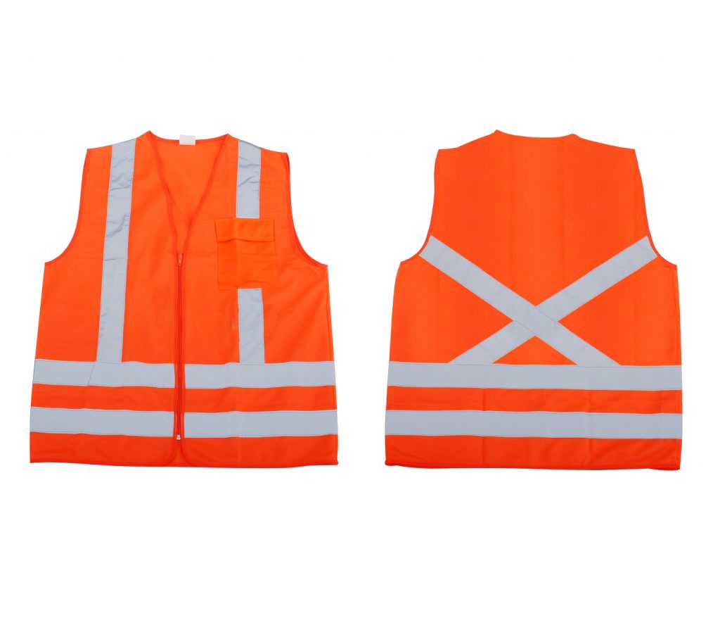 Colete de sinalização de alta visibilidade, com 1 bolso. Confeccionado em tecido fluorescente 100% poliéster, combinado com faixas retrorrefletivas repelentes de água em X, com paralelas horizontais nas costas, verticais e horizontais na parte frontal, fechamento frontal em zíper.