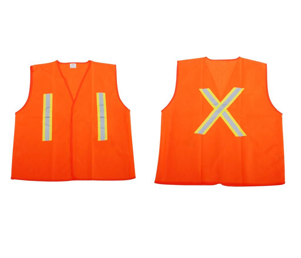 Colete de sinalização de alta visibilidade, confeccionado em tecido fluorescente 100% poliéster, combinado com faixas retrorrefletivas repelentes de água em X nas costas, paralelas na parte frontal e fechamento frontal em velcro.