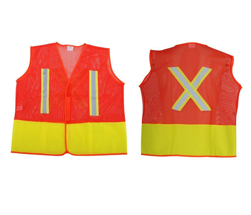 Colete de sinalização de alta visibilidade, confeccionado em tecido fluorescente 100% poliéster, combinado com faixas retrorrefletivas repelentes de água em X nas costas, paralelas na parte frontal e fechamento frontal em velcro.