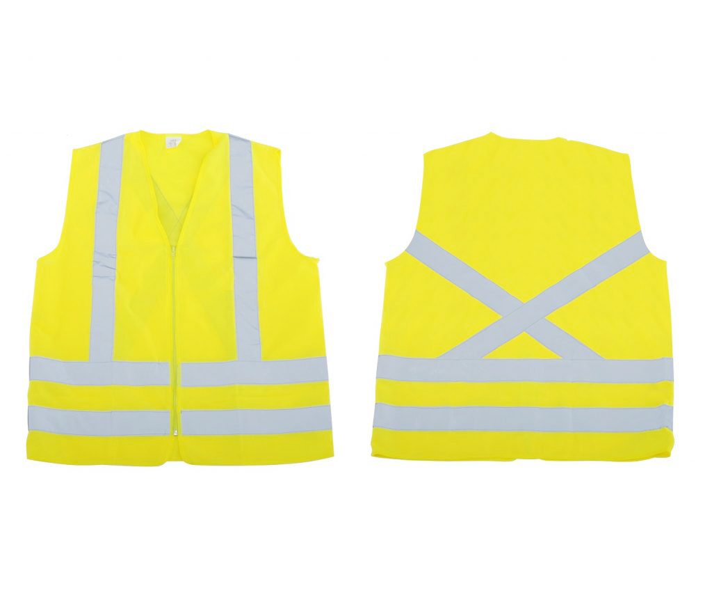 Colete de sinalização de alta visibilidade, confeccionado em tecido fluorescente 100% poliéster, combinado com faixas retrorrefletivas repelentes de água em X com paralelas horizontais nas costas, verticais e horizontais na parte frontal, fechamento frontal em zíper.