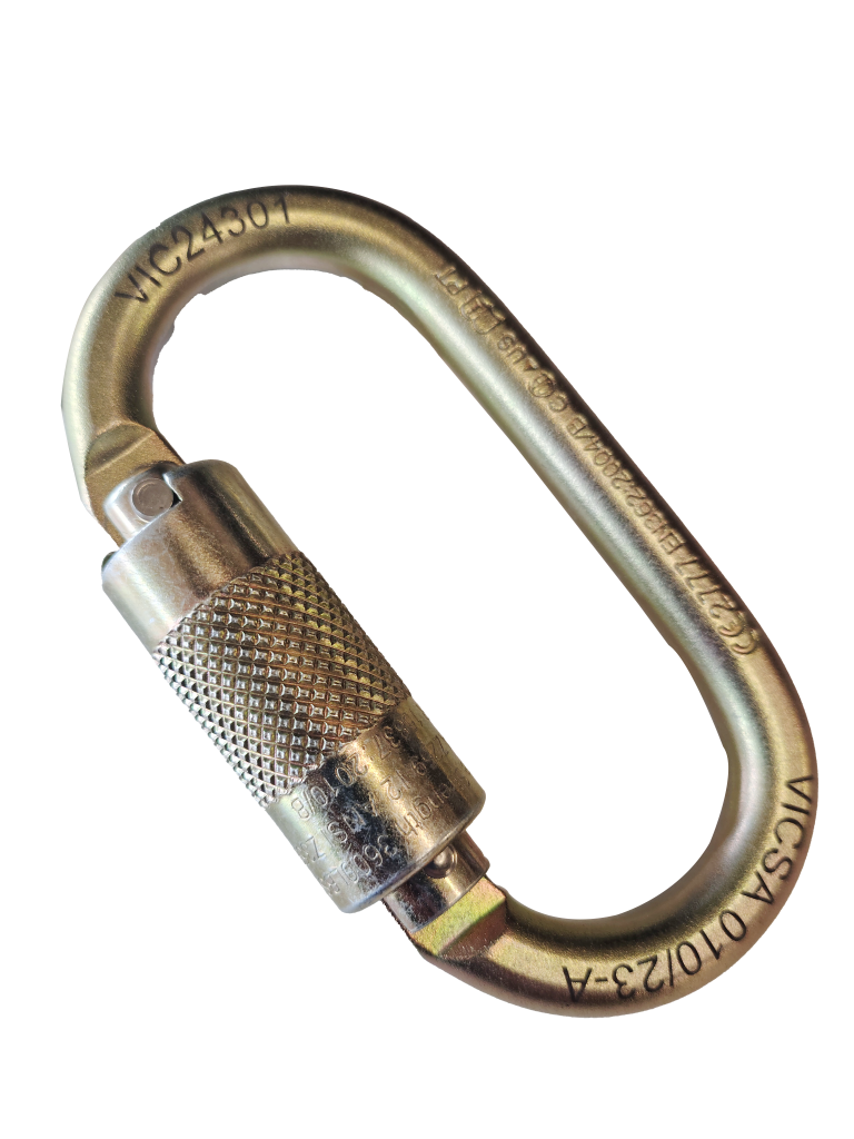 Mosquetão oval confeccionado em aço forjado, com abertura de 17mm. Possui trava dupla e fechamento automático