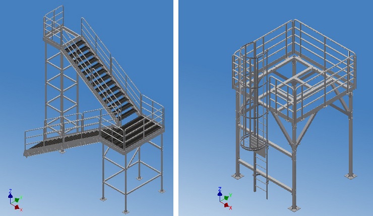 São atividades onde o usuário necessita um acesso seguro à áreas com diferença de nível. Realizamos o projeto, fabricação e instalação de escadas metálicas sendo inclinadas ou do tipo marinheiro, passarelas e guarda corpo.