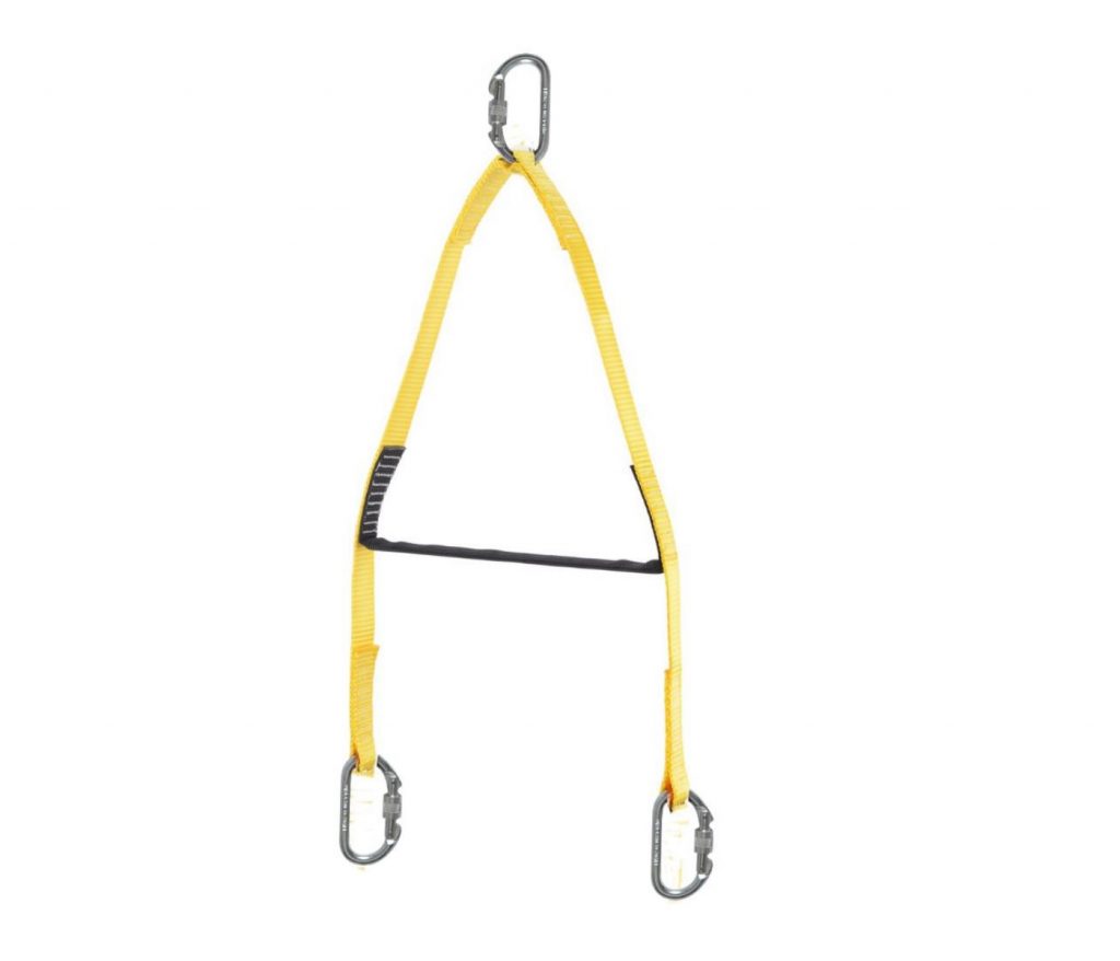 Suporte em fita de poliéster com mosquetões em aço forjado com 17 mm de abertura, trava dupla e fechamento em rosca.